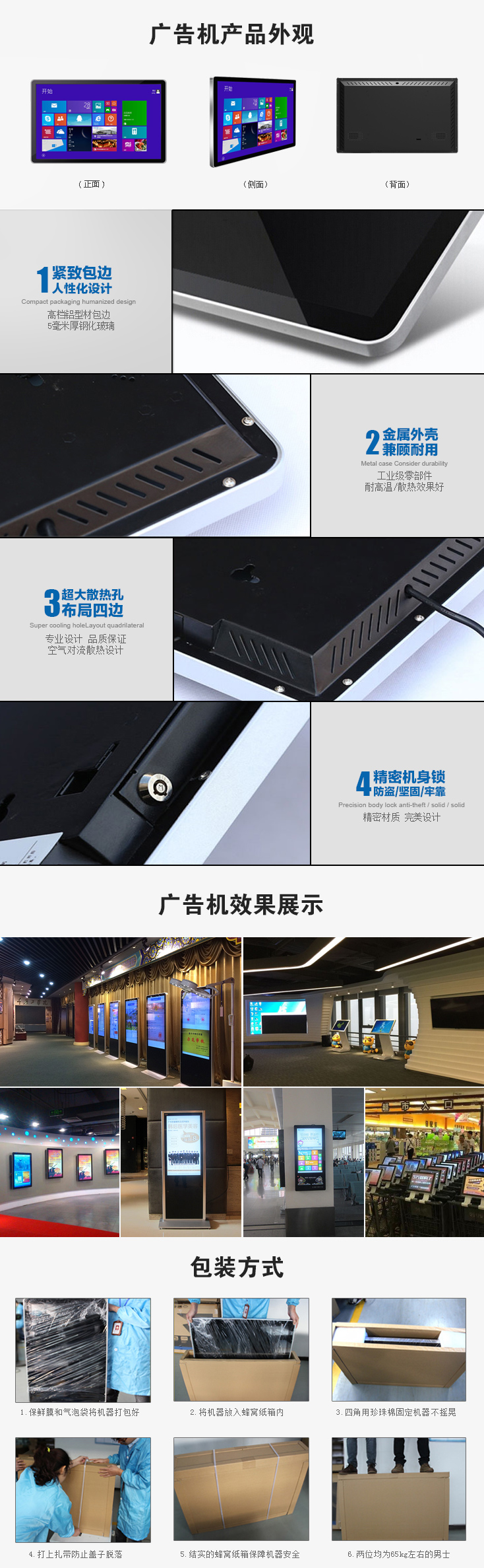 1、外殼選用優質金屬材料制作,表面并經噴粉工藝處理;外殼顏色以,黑,銀色為主,面帶亞克力面板防刮傷??筛鶕蛻粢蠖ㄗ?;采用后背墻掛方式。