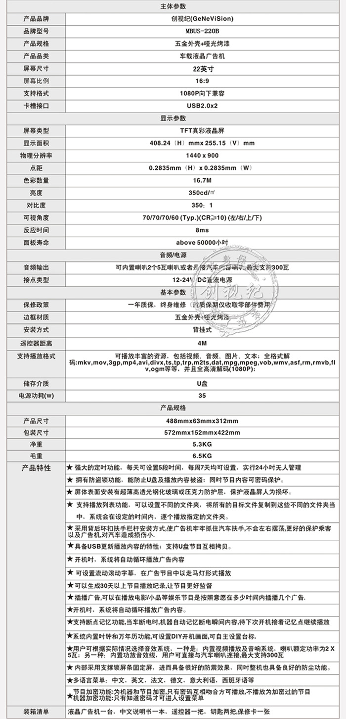 產(chǎn)品名稱: 22寸車載廣告機