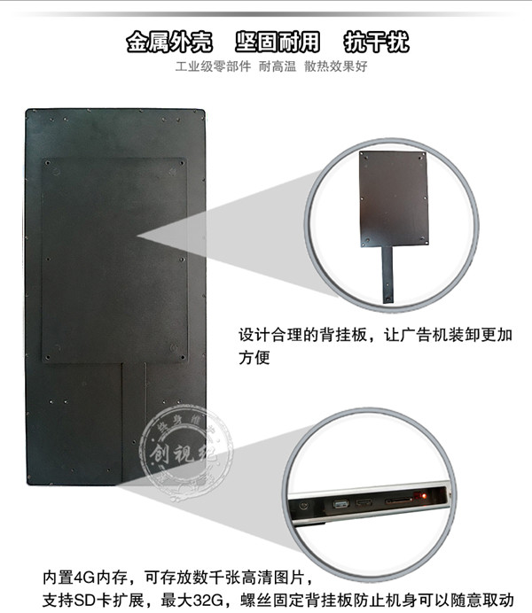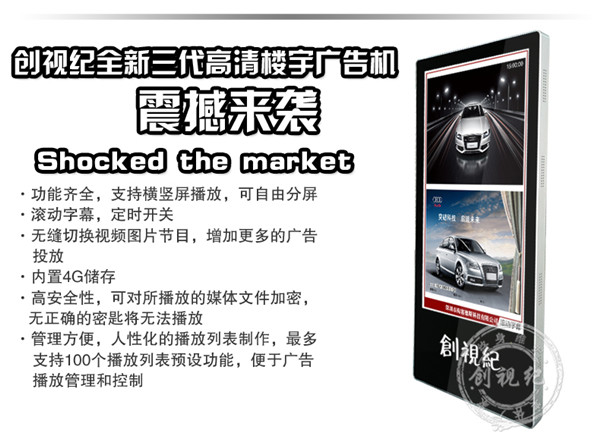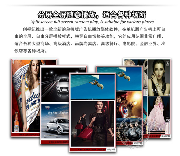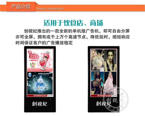 對比性 | 看家本領: ★成本低,能滿足常規的廣告機播放功能; ★高清1080P視頻、圖片播放; ★一鍵拷貝節目、支持 HDMI接口輸入,可當顯示器之用。不足之處:豎屏片源需要第三方軟件制作、剪輯。分屏制作繁瑣。 | 看家本領: ★解決客戶橫豎屏轉換問題,可自動對應機器旋轉視頻; ★內置4G內存,烤貝快、播放穩定、永不卡殼; ★真正客戶自由分屏,真正的實現視頻,圖片,字幕,日期的隨機組合;想怎么分就怎么分; ★目前唯一能真正實現節目之間的無縫切換的方案; ★疊加背景圖片,使畫面更美觀; ★雙芯片、真正1080P的全高清解碼;目前只有我們和分眾傳媒使用此方案。 | 看家本領: ★遠程控制、管理、下發節目; ★兼容更多格式,天氣預報等,內容豐富,操作so easy! ★后臺軟件功能強大,關鍵點是穩定,支持同時上萬終端在線; ★隨機搭配服務器安裝軟件; ★擴展性強、可安裝任意APP,滿足你的任何任性; ★支持阿里云服務器,強大的技術支持。真正的廣告媒體運營最佳選擇,穩定壓到一切。不足之處:暫時沒有(這個可以有,這個真沒有...) |