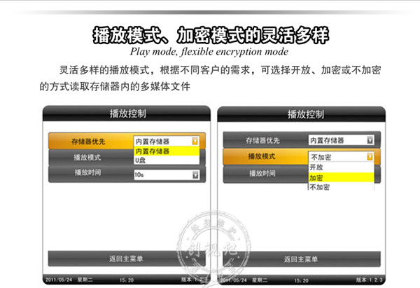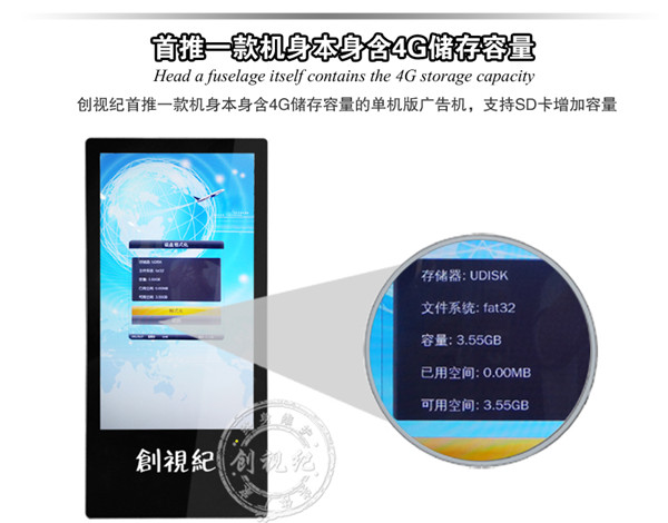 控制方式 | 通過U盤,SD卡播放播放 | 通過U盤,SD卡更新節目,直接將內容導入機器內存,(內置4G 內存)優點:客戶無需另配內存卡;拷貝速度快 | 通過電腦用網絡(支持有線,wifi,可選3G)連接廣告機,電腦后臺統一遠程控制、管理 |