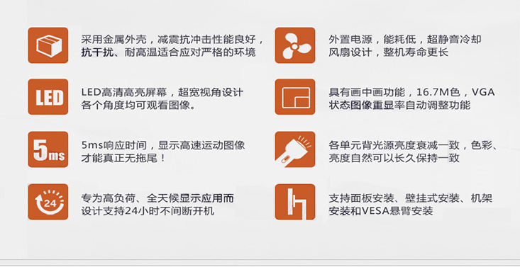 顯示亮度: 500cd/m2 | 環境濕度: <80% span=""> | 工作溫度: -10℃-60℃ |