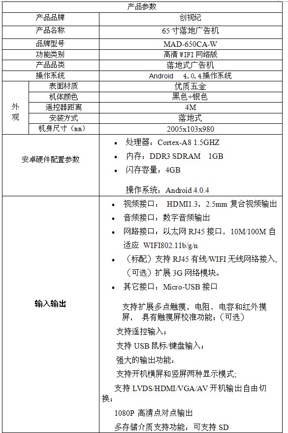 $?:0?c?xntext-indent:0.7200pt; margin-left:-0.7200pt; margin-right:17.9550pt; margin-bottom:0pt; margin-top:0pt; " >2、多國語言:支持中文、英文等絕大多數國家語言,TTF矢量字庫支持,顯示不失真;3、 定時開關機:利于節省能源,并且延長其使用壽命;設定開關機時間后,整個系統在開機時間段自動啟動。在關機時間段自動停止運行進入關機狀態。關機狀態下,設備不響應外部操作,不輸出任何音視頻信號;