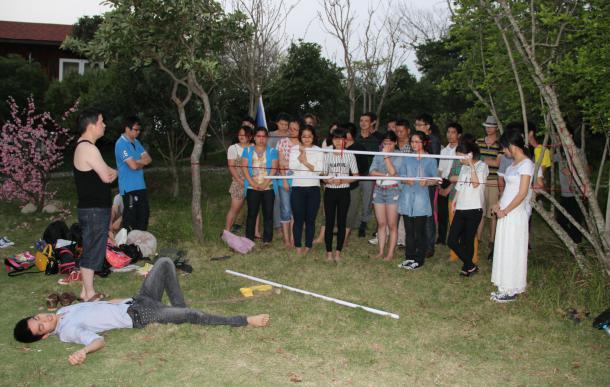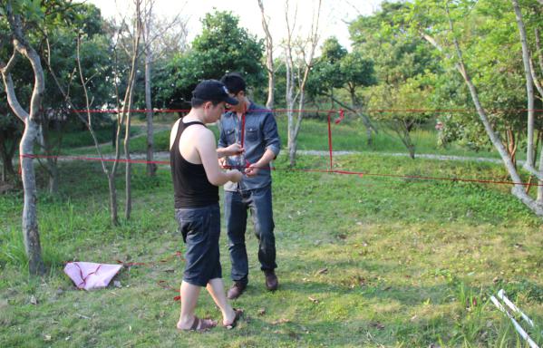 李總親自在準備游戲道具,穿越火線規則,將隊員從用紅線圈成的逃生圈穿過,人的身體其任何衣物不許碰到線,若碰到線,則過去的人員全部返回重新來過。